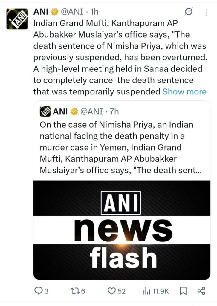 Nimisha Priya Case में यमन ने मौत की सजा रद्द की। भारत सरकार और मुफ्ती अबुबकर के प्रयासों से आई बड़ी कूटनीतिक सफलता।भारतीय नर्स निमिषा प्रिया (Nimisha Priya Case) को यमन में मिली मौत की सज़ा को रद्द कर दिया गया है। यह फैसला न सिर्फ भारत के लिए एक बड़ी कूटनीतिक सफलता है, बल्कि उन लाखों भारतीयों के लिए राहत की खबर है जो विदेशों में काम करते हैं। यह मामला सालों से अंतरराष्ट्रीय मानवाधिकार मंचों और मीडिया में छाया हुआ था। आखिरकार भारत सरकार, सामाजिक संगठनों और खासकर ग्रैंड मुफ्ती अबुबकर मुसलियार के प्रयास रंग लाए।